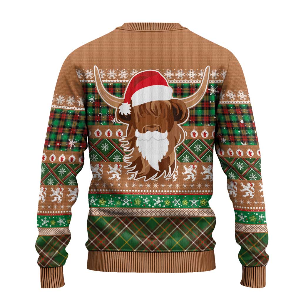 Camisola de Natal escocesa feia, estilo Highland Cattle, com riscas xadrez natalícias, em castanho.